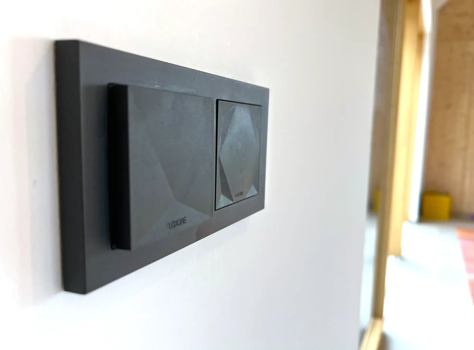 A Loxone Nano Relay Tree típusú eszközök esztétikus elhelyezése különös figyelmet igényelt. A problémát azzal oldották meg, hogy ezeket közeli mély konnektor dobozokba vagy a kapcsolók mögé építették be, így rejtve maradtak a szem elől.