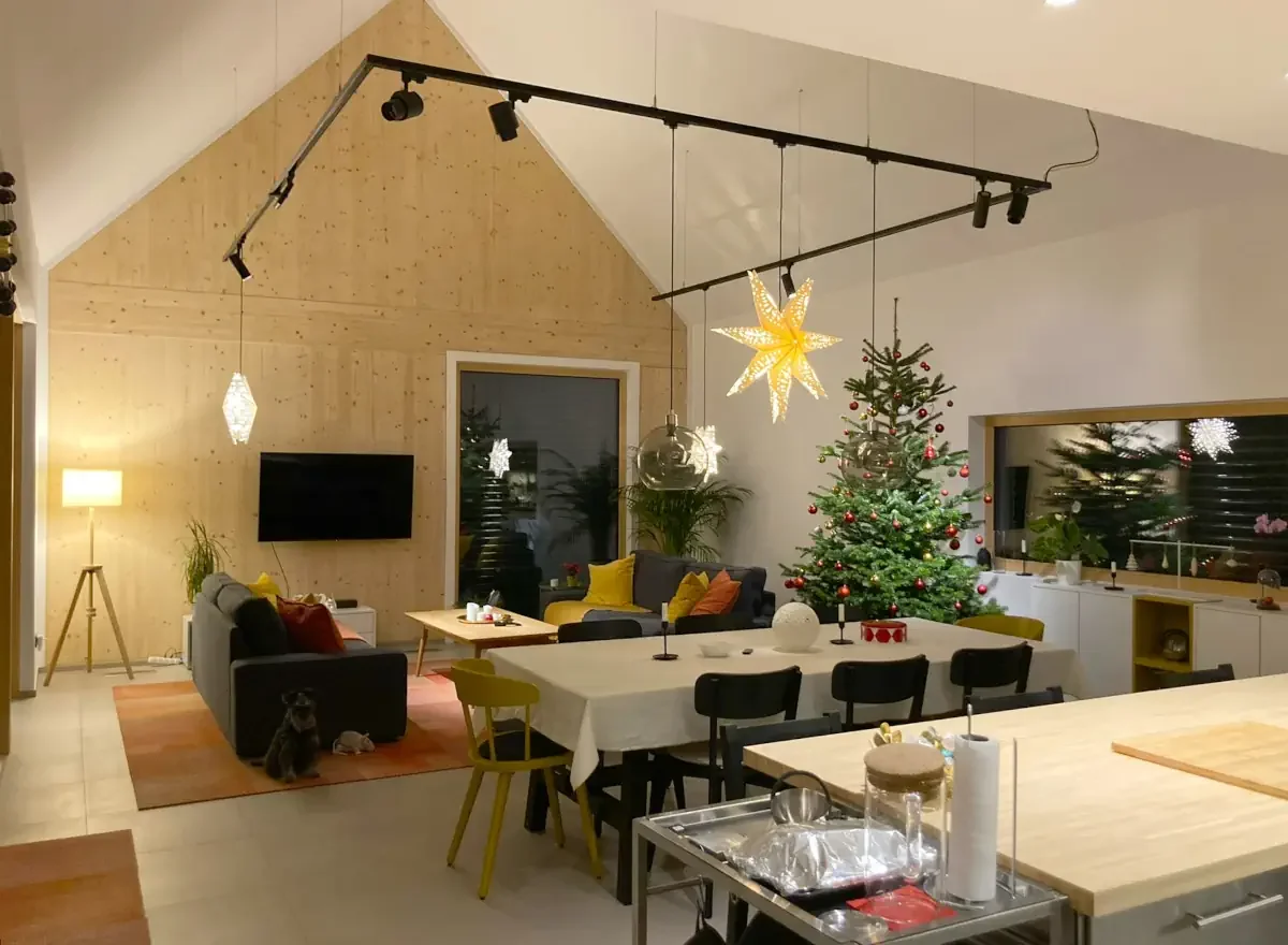 A közösségi terekben, mint a nappali, konyha és étkező, már összetettebb hangélményre volt igény. Ezekben a helyiségekben a hangrendszer kettős mennyezeti hangszóróval és egy aktív mélynyomóval együtt lett beépítve, amely részletgazdag hangzást biztosít a minőségi zenehallgatáshoz.